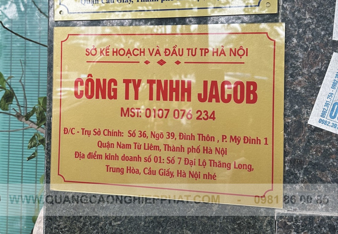 Biển tên công ty là bắt buộc đối với tổ chức, doanh nghiệp, công ty, nhà xưởng … Biển tên công ty bao gồm những nội dung cơ bản như cơ quan cấp giấy phép kinh doanh, tên công ty, mã số thuế, địa chỉ trụ sở hoặc văn phòng, hay thông tin liên hệ như điện thoại, email, website …