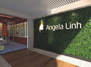 Vách trang trí trung tâm thể hiện nhận diện thương hiệu, giúp ghi dấu ấn mạnh mẽ với khách hàng, thường sử dụng đèn led hoặc kết hợp với vật liệu tự nhiên như cỏ, hoa tạo hiệu ứng ấn tượng.